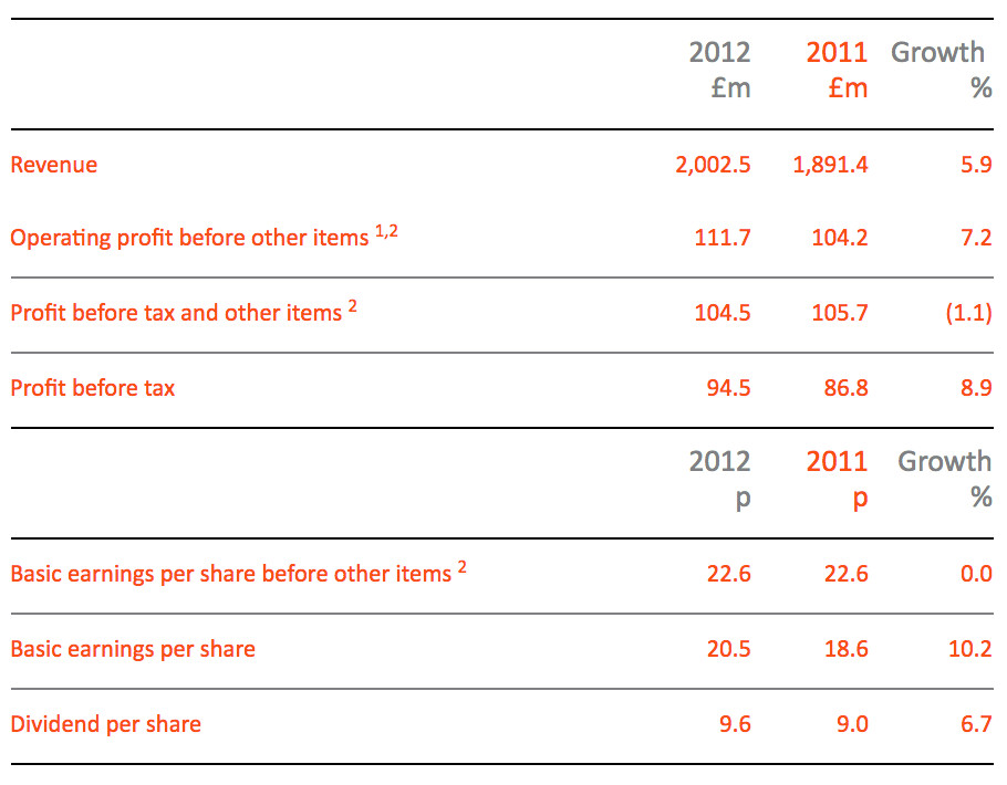 - Operating profit before other items1,2 up 7.2% to £111.7m (2011: £104.2m excluding £4.1m pension credit)